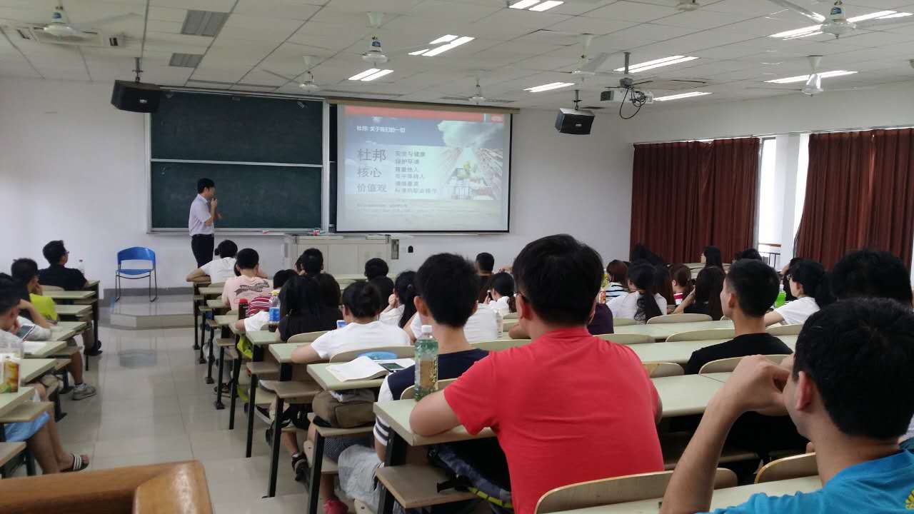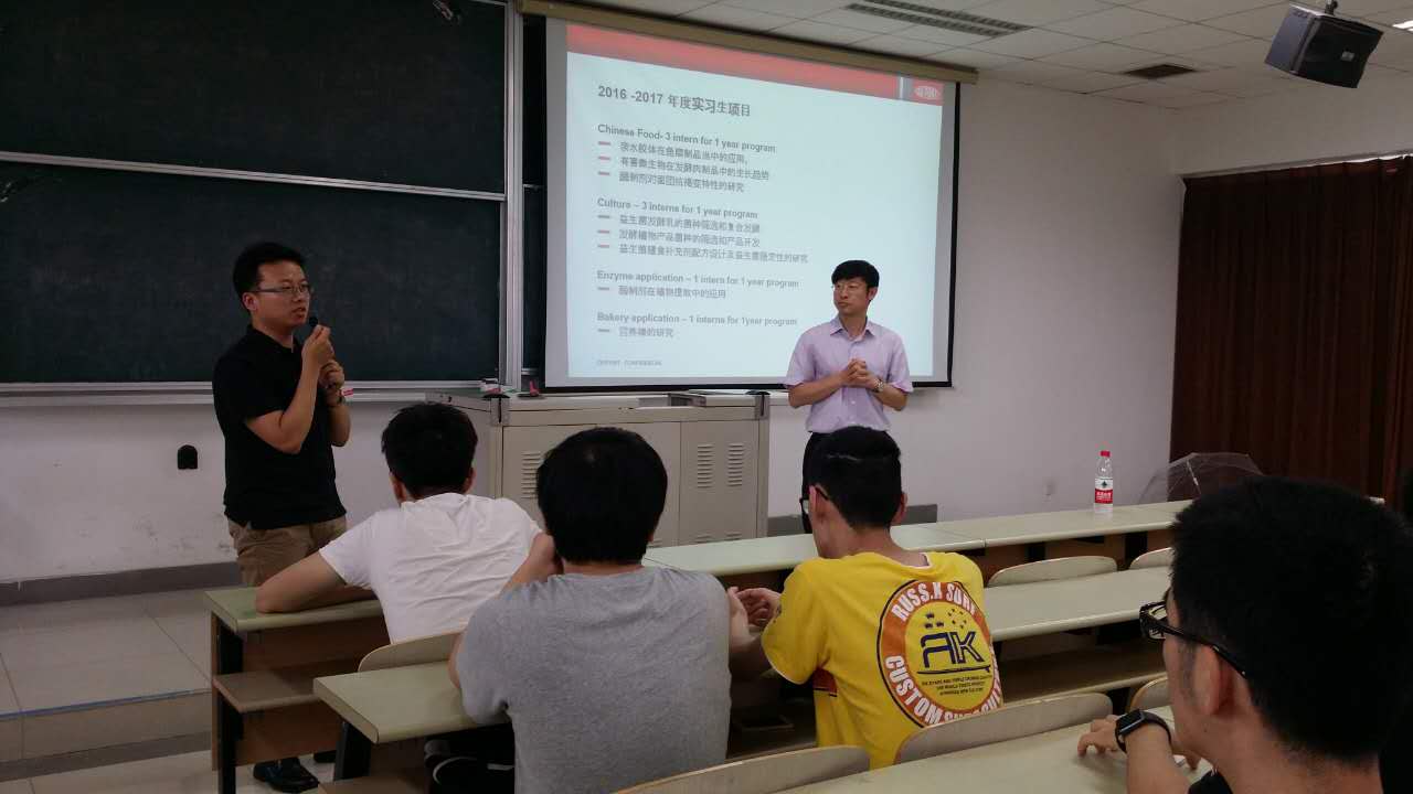 杜邦营养与健康(原丹尼斯克集团)隶属美国杜邦集团,是全球最大的健康配料、生物酶和益生菌生产供应商。宣讲会上,杜邦营养与健康的研发总监乔全胜从公司理念、业务范围、研究课题等多个角度介绍,让大家对该公司有了初步的认识。另外,乔全胜还抛出了橄榄枝——十余个研究课题,鼓励食品系学生来到杜邦,共同参与研发,同时完成毕业课题。