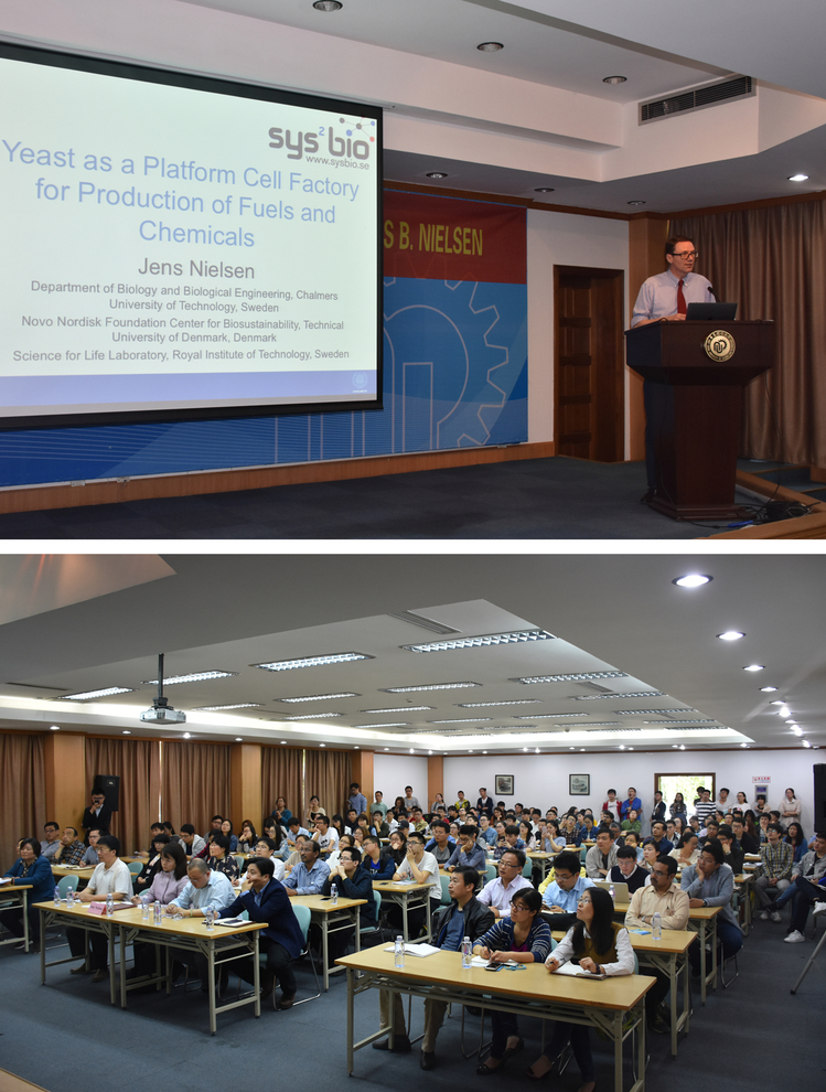 师生作了题为“Yeast as a Platform Cell Factory for Production of Fuels and Chemicals”的学术报告。报告围绕酿酒酵母代谢工程改造,酿酒酵母系统生物学,以及实验室进化等方面,系统介绍了近年来其领导的查尔姆斯理工大学系统生物技术实验室的研究成果,包括次级代谢产物生产、脂肪酸合成、酵母多组学分析平台等。报告后Jens Nielsen院士与萝莉社
