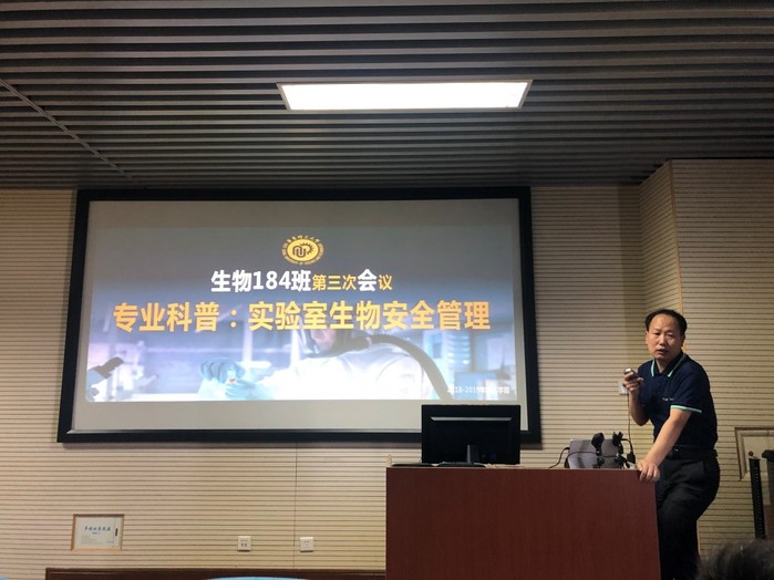 523日下午,生物184班本学期第三次班会于奉贤校区实验7601进行,班会由班导师马悦主持,主题为病原微生物实验室的生物安全管理。