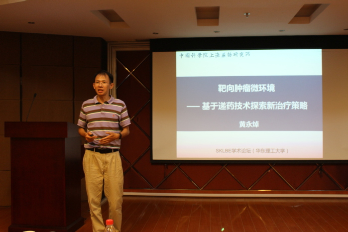 上海药物所研究组长黄永焯研究员来校访问,并开展了“靶向肿瘤微环境的递药及治疗策略”的主题讲座。此次报告会由赵黎明教授主持,生物反应器工程国家重点实验室主任张立新教授应邀出席了本次报告交流会。