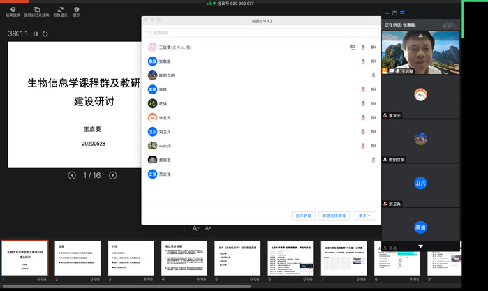 本科教学和萝莉社工作的互动,推进生物工程/生物技术一流本科专业和一流本科课程建设,培养拔尖和创新型的本科人才,生物信息学与生物系统教研组于2020年5月28日在教学副院长王启要的组织下在线上召开了第一次全体教师会议,共同讨论生物信息学与生物系统课程群的课程建设目标、建设思路和教改路径。会议邀请到张惠展、吴海珍和花强等教授参会。