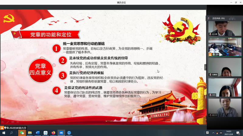 2月8日下午,在实验室十八楼202室,支部进行了党课理论学习,党课内容主要分为三个部分:学习党章党规、学习十九届五中全会精神、学习习近平总书记考察上海系列讲话。首先由高猛峰同志带着大家系统地学习了《中国共产党章程》,深入地讲述了其历史沿革,尤其是党的十九大对党章修改的具体内容以及关于习近平新时代中国特色社会主义思想等最新党章内容作了详释。接着由梁心怡同志带领全体同志观看并学习了习近平总书记考察上海重要讲话的相关视频资料。随后邓琳琳同志就十九届五中全会的关键词进行了相关解读,恰值“两个一百年”奋斗目标的历史交汇期,十九届五中全会具有重要意义,学习十九届五中全会精神对于广大党员同志尤为重要。最后,赵黎明老师就本次党课学习做了总结发言,并对支部2021年度党建活动做了指导。赵黎明老师强调,作为青年学生党员,其一要坚守初心和使命,把学党史、学党章、抓党建与促中心工作深度结合,结合自身实际,为锻造社会所需的萝莉社人才、产出更多社会需要的萝莉社成果而努力。其二要切实发挥好模范带头作用,形成党支部战斗堡垒,带领实验室同学们共同进步,提升综合素养;其三要认真学习,内外兼修,抓住历史的机遇,创造出彩人生!