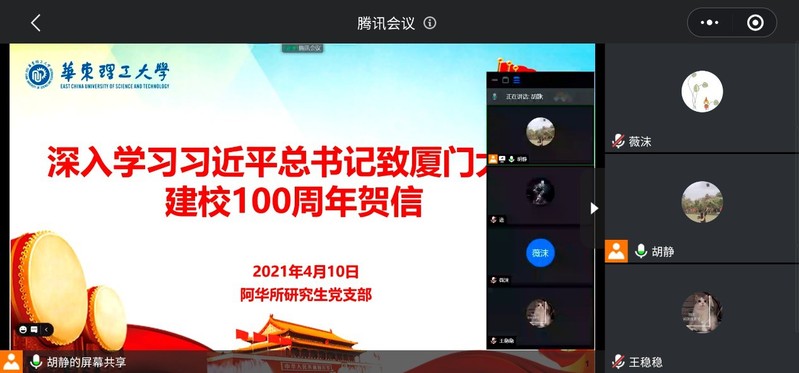 鲁华所教工党支部全体党员齐聚线上,对“习近平总书记致厦门大学建校100周年贺信”进行专题学习和集中研讨,教师党员表示要落实立德树人根本任务,为党育人、为国育才,为增强中华民族凝聚力和向心力,为全面建设社会主义现代化国家、实现中华民族伟大复兴的中国梦作出新的更大贡献。