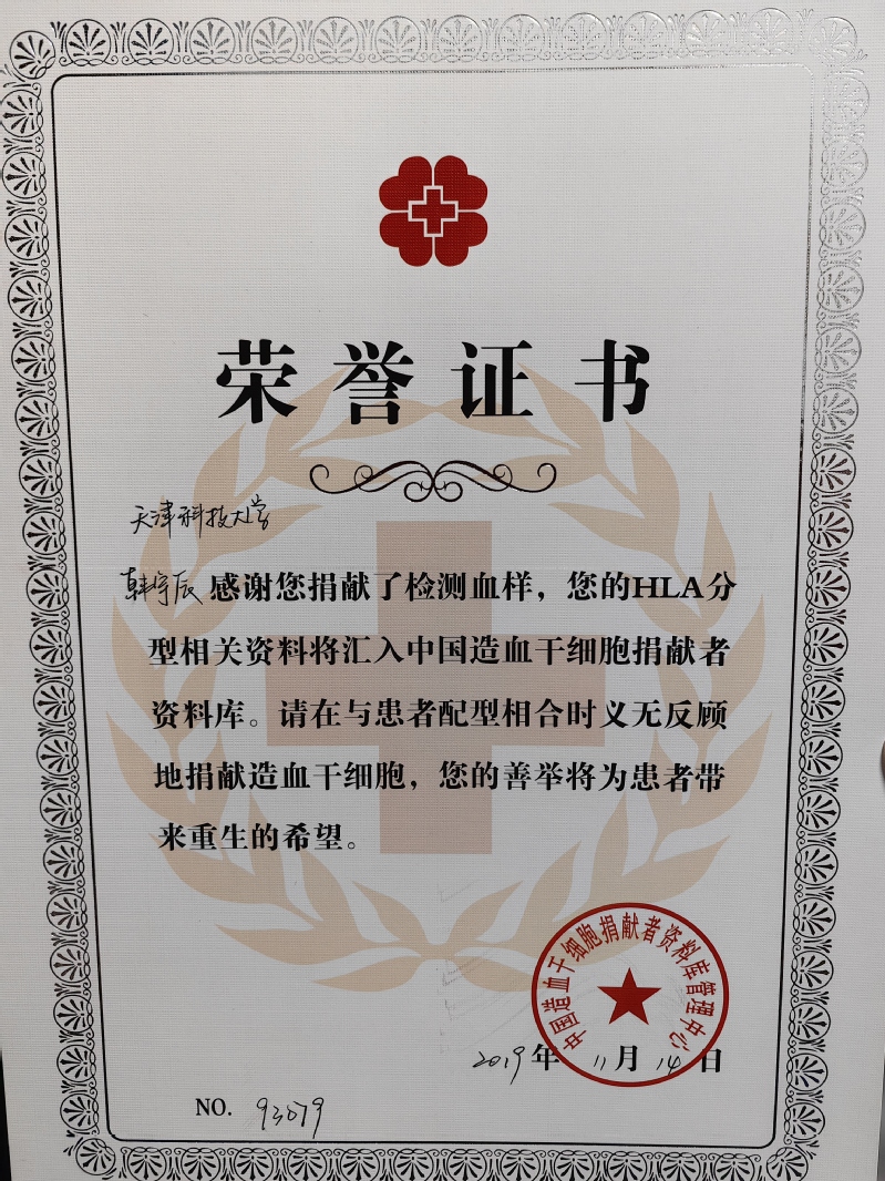 刚入库时,韩宇辰并没有将此事告诉自己的家人,“成功匹配的几率太低了,也不想给家人们徒增担忧”。3年后,2022年初,正值大学本科时期的最后一个寒假,一通电话打破了假期的宁静。天津红十字会的工作人员告知他匹配成功了,询问是否还有意愿继续捐献。没有任何迟疑,他立即回复了“愿意”,初配成功后,他告知家人,“我的母亲听我说完就立刻表示了支持,父亲一开始还表露出了担心,但最终还是被说服了”。