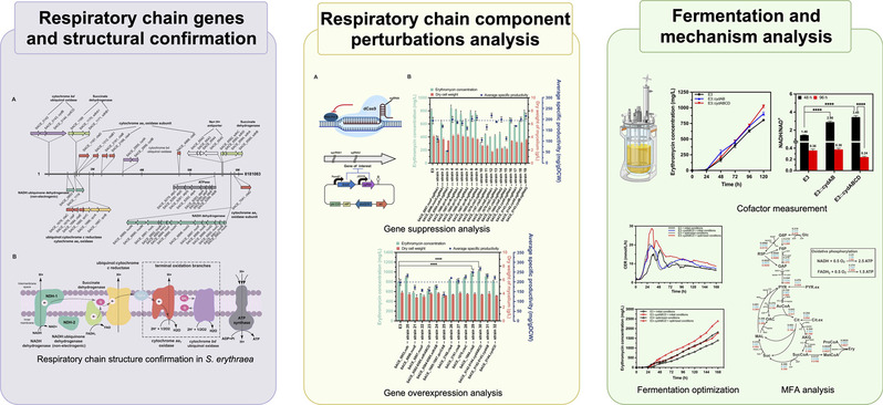 ,团队使用CDM对红霉素生产进行了深入研究。针对红霉素合成过程中ATP需求高的特点,研究团队对红色糖多孢菌电子传递链的结构和功能进行详细解析,通过对各组分表达增强或抑制,明确了NADH脱氢酶和末端氧化酶对于菌体能量代谢的关键作用。通过对bd型末端氧化酶的过表达,实现了对胞内NADH/NAD+比例的调控,提升了胞内ATP含量,在摇瓶水平产量提升了26.5%。通过发酵优化,在5 L生物反应器中利用CDM获得了2400 mg/L的红霉素产量,表明了该菌种的潜在工业价值。该研究表明,呼吸链工程是优化氧化还原平衡和提高工业抗生素产量的有效策略。