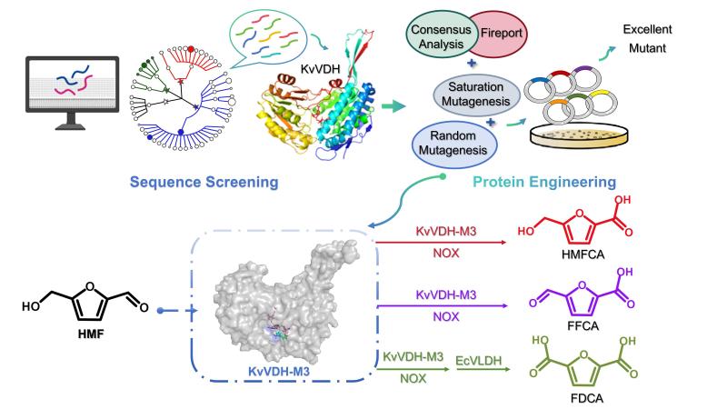 方向取得的创新研究成果,论文题目为“Novel iterative genome mining and engineering of a bifunctional KvVDH enable selective production of furan carboxylic acids from high-concentration 5-hydroxymethylfurfural”。该研究建立了高效、高选择性的生物催化平台,为将高浓度HMF选择性转化为各增值呋喃羧酸提供了一种有前途的方法。